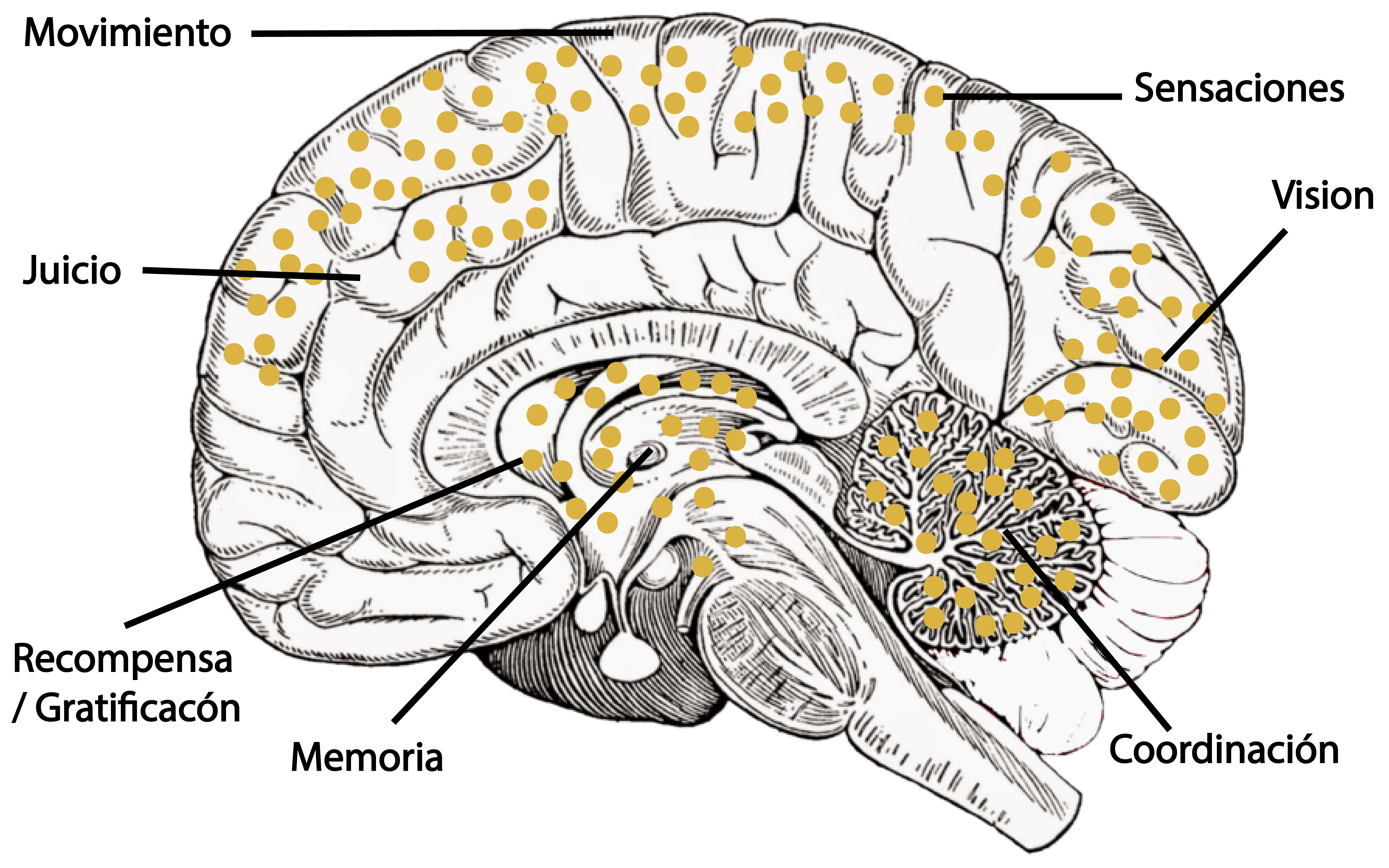Al actuar directamente con los neurotransmisores del cerebro, suelen afectar las regiones del cerebro que influyen en el placer, la memoria, el pensamiento, la concentración, el movimiento, la coordinación y la percepción del tiempo y el espacio.